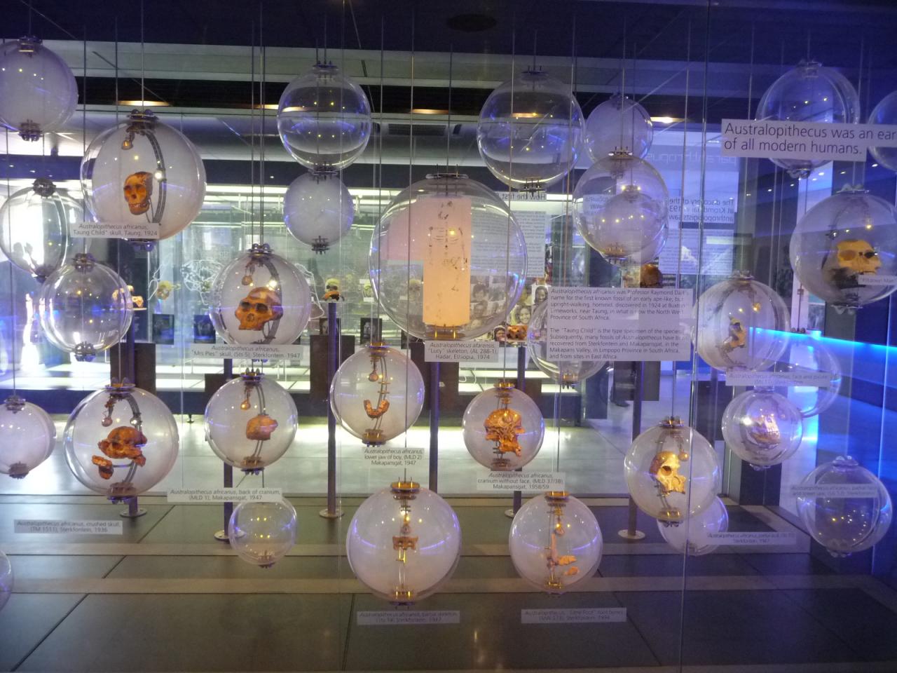 Cette vitrine du musée de Sterkfontain présente des éléments de squelettes d'Australopithecus Africanus (datés entre 4,1 et 3,3 millions d'années)
