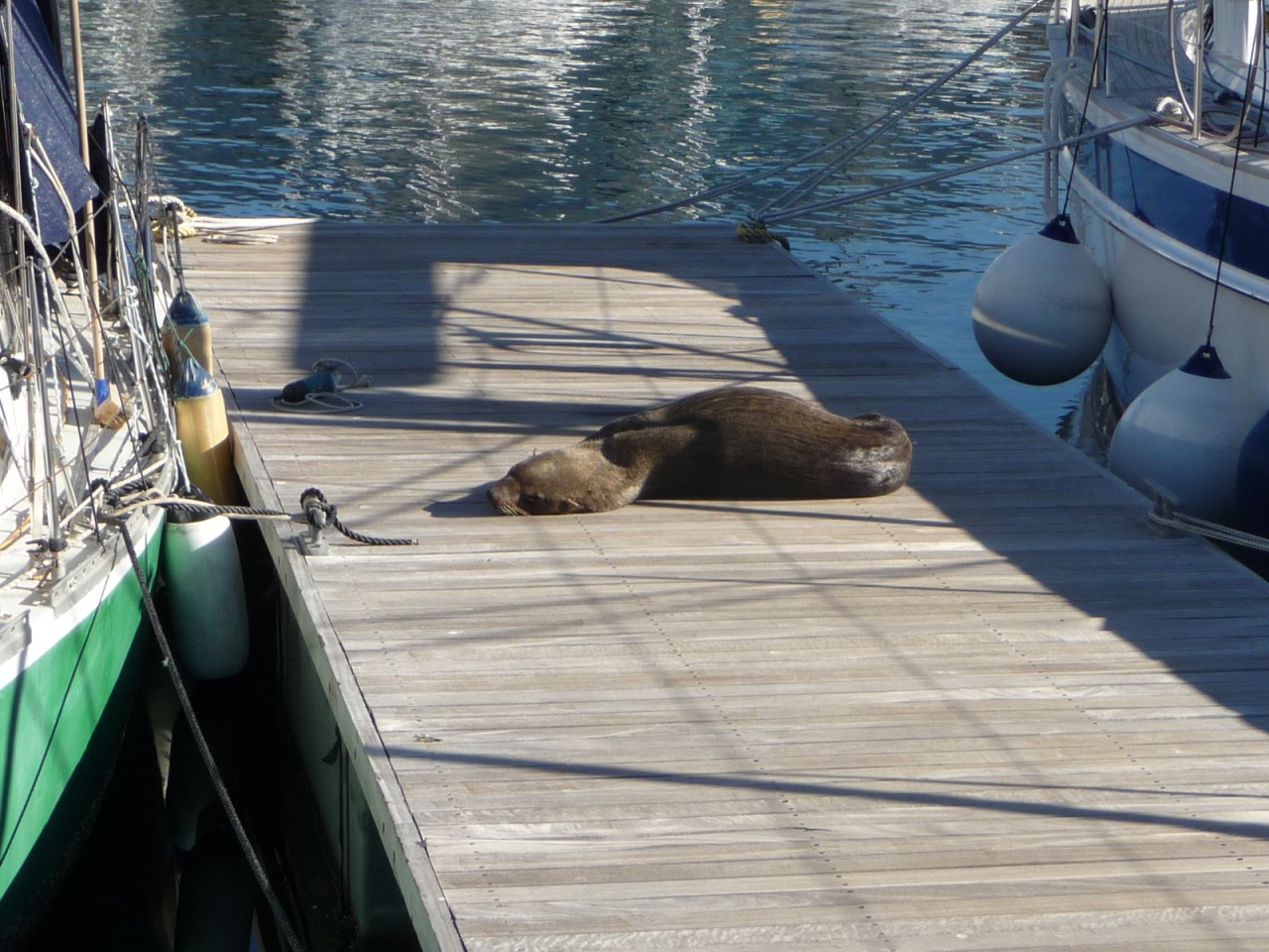Chaque jours quelques otaries (en provenance de l'antarctique ?) viennent bronzer sur les pontons du port de plaisance ! Cela nous rappelle les otaries du quai 39 à San Francisco où nous avions vu la même chose !