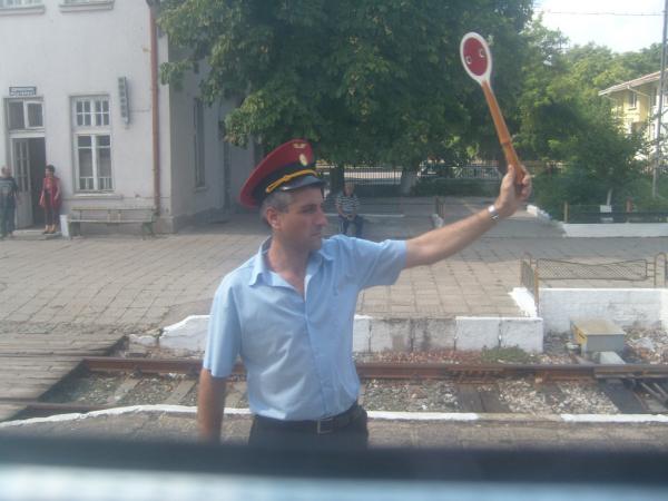 Le chef de gare avec sa casquette kepi, donne le signal par un coup de sifflet ou en actionnant une cloche