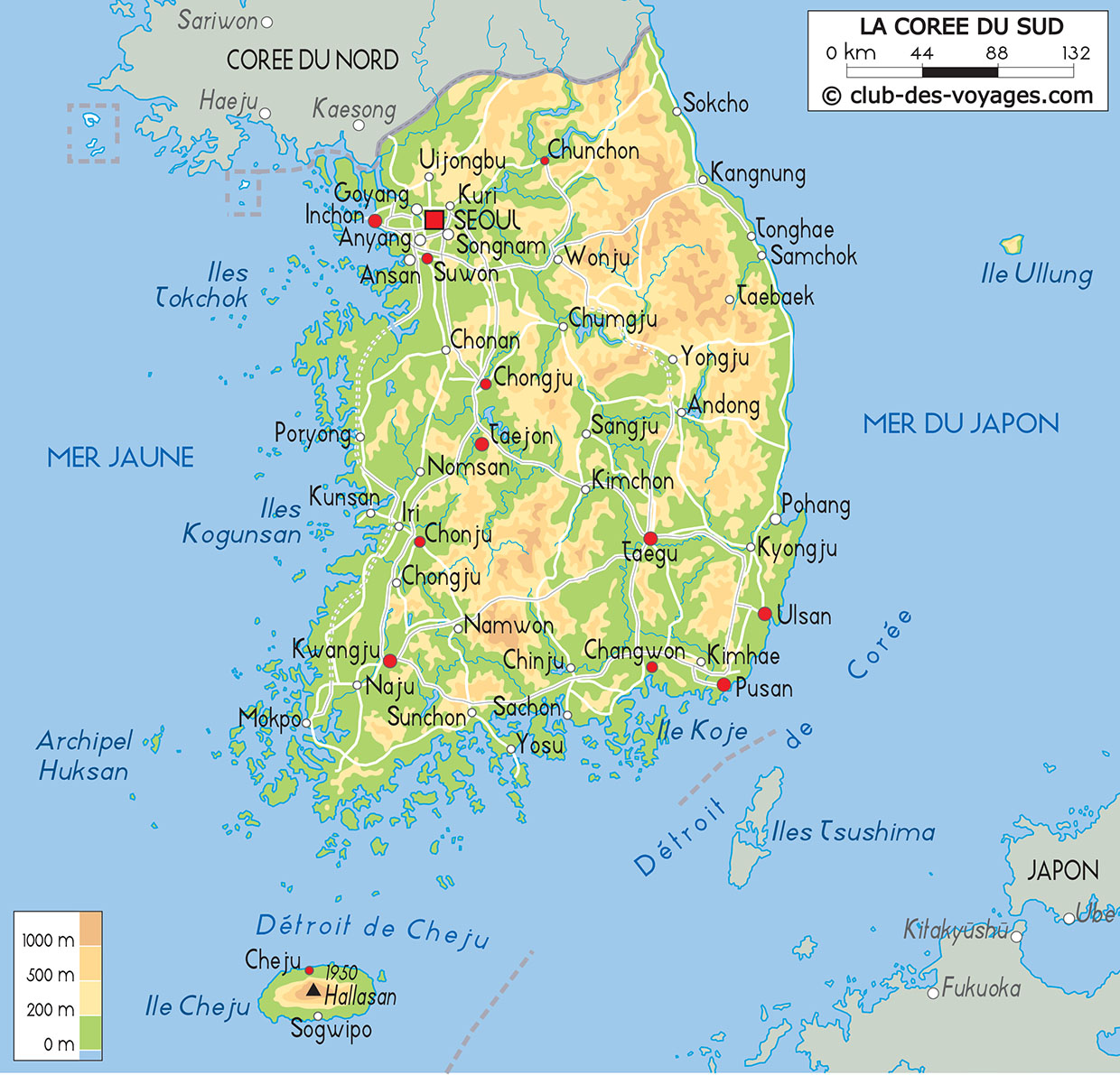 Nos différentes cartes de la Corée du Sud à explorer: carte physique, carte routière, vue satellite. Pour tout savoir sur la géographie de la Corée du Sud.