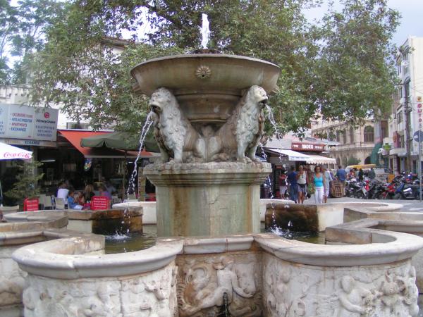 Le quartier de la fontaine Morosini. Autour de cette jolie fontaine vénitienne, où fusionnent touristes et Crétois, se concentre une bonne partie de l'activité des habitants d'Héraklion. La fontaine date de 1628.Les lions qui soutiennent la vasque proviennent d'un monument du XIX siècle.