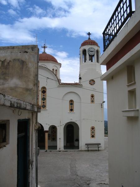 L 'église Agios Georgios Charakitis à Kritsa. La rue depuis laquelle la photo a été prise est très étroite.
