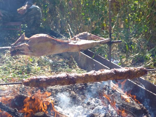 cuisson traditionnelle de l'agneau de Paques au feu de bois sur un bbq des plus sommaire. A l'avant, cuisson des abats (coeur, foie, poumon etc ...): un vrai régal pour les Crétois.