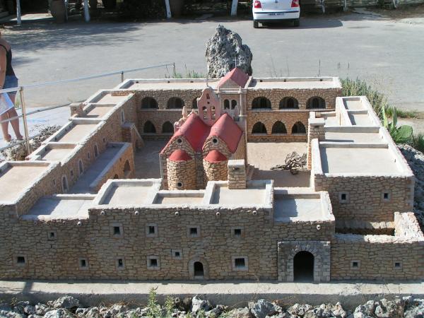 Une maquette du monastere, vue à côté d'une plage de Georgioupoli (il y en a 5 ou 6 autres superbes, representant des monuments grecs ou crétois).....