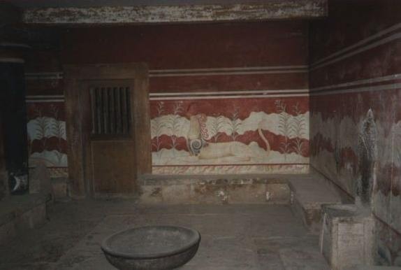Le trône est en albâtre. Observez sur les murs les fresques à motifs de griffons (reconstituées).