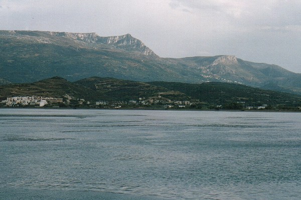 Ormos Sitia et les montagnes d'Achladia vues depuis la jetée du port. Ces montagnes, dos à la ville, portent des éoliennes productrices d'électricité faisant échos aux moulins à vent de la plaine du Lassithi , chargés de pomper l'eau.