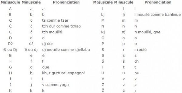 Le croate est une langue slave dont l'alphabet comprend 30 lettres et utilise les caractères latins depuis le XVe siècle. Contrairement au français, toutes les lettres se prononcent, il n'existe pas de lettre muette. Notez également que les lettres q, x et y n'existent pas dans l'alphabet croate (sauf pour les mots étrangers), tandis que les lettres č, ć, dž, ð, š et ž n'existent pas en français.
