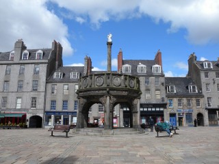Au centre de la ville, sur la place médiévale qui prolonge Union Street, s'élève la Mercat Cross (la croix du Marché), symbole du royaume d'Écosse. Union Street est la principale artère commerçante. Au début, elle est bordée par Town House, un édifice de granit englobant une tour du XIVe siècle. En remontant Broad Street on arrive au Marischal College, construit après le King's College. Non loin, l'église Saint Nicholas et la Provost Skene's House font partie des édifices d'Aberdeen les plus intéressants par leur architecture.