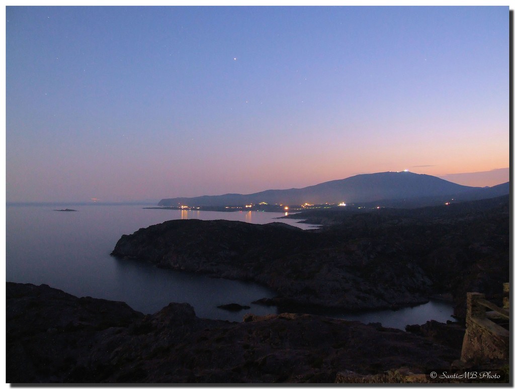 On aperçoit plusieurs localisé au loin, dont l'Estartit et le village de Cadaquès. L'étoile dans le ciel est Vénus...