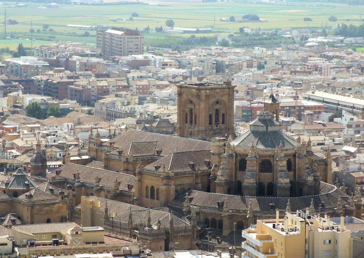 Cette photo montre la cathédrale de Grenade, en Andalousie, vue depuis l'Alhambra. La cathédrale de Grenade se trouve au coeur de quartiers anciens de la ville. A l'arrière-plan, on aperçoit la campagne.
