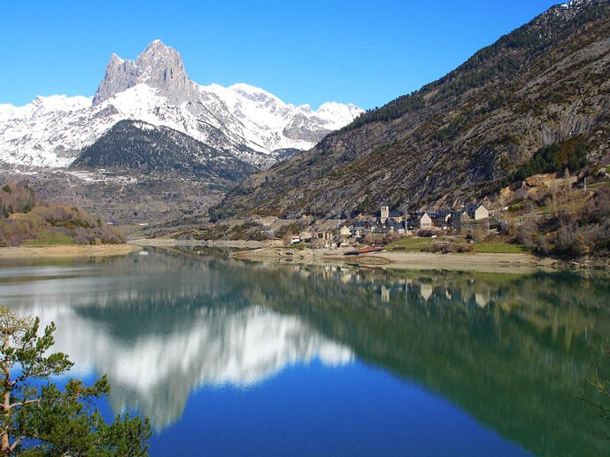 La photo jour présente le petit village de Sallent de Gallego dans les Pyrénées espagnoles, avec en arrière-plan les montagnes enneigées et le lac au pied du village