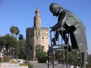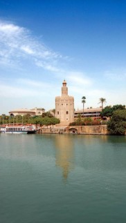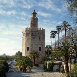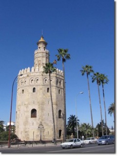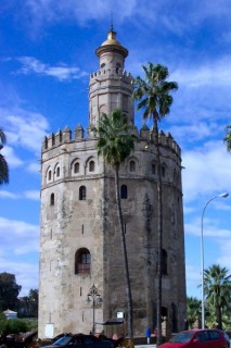 La Torre de Oro, qui surplombe le Guadalquivir, est une tour Almohade qui date du XIIIème siècle. Elle faisait partie des remparts de la ville. A l'origine, elle était recouverte d'azulejos dorés; elle permettait de fermer l'accès au Guadalquivir en tirant une chaîne qui était attachée sur une tour située sur la rive opposée du fleuve. Sur le plan architectural, la Torre de Oro est composée de 12 pans; la partie inférieure de la tour est construite en pierre, la partie supérieure en briques. La tourelle qui se trouve à son sommet a été construite au XVIIIème siècle. La tour abrite aujourd'hui le Musée de la Marine.