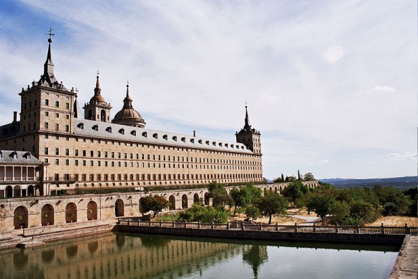 Photo d'une des façades de l'Escorial. Au premier plan, bassin et jardins
