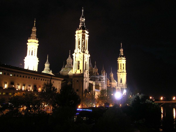 Saragosse : l'Ebre, le pont romain et la Virgen del Pilar de nuit |