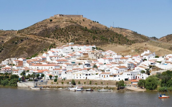 Cette photo montre le petit village de Sanlucar de Guadiana, en Andalousie (province de Huelva). Sanlucar de Guadiana se trouve à la frontière de l'Espagne et du Portugal. La photo est prise depuis Alcoutim au Portugal, sur la rive opposée du fleuve Guadiana.