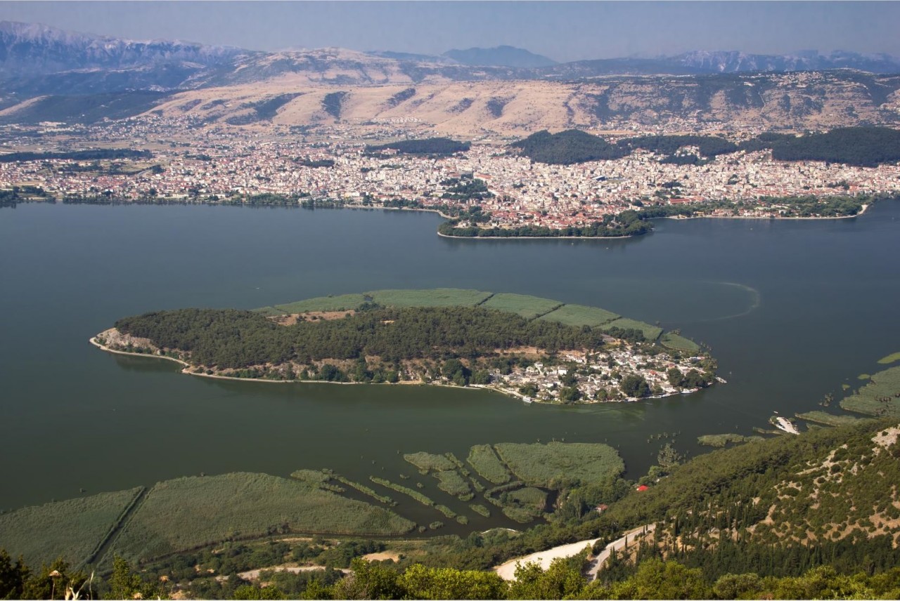 Vue sur la ville de Ioannina et sur le lac Pamvotis avec son île. Cette photo a été prise depuis le village de Ligiades.