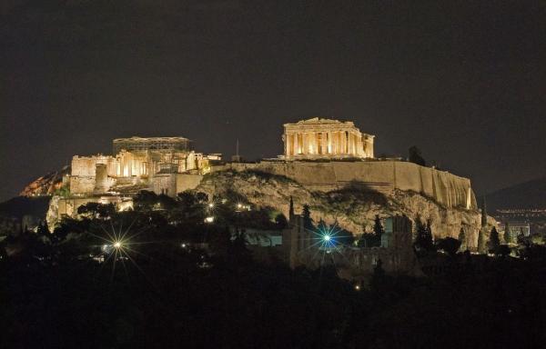Dans le cadre de la mise en valeur d'Athènes pour les Jeux Olympiques d'Athènes de 2004, les Grecs ont fait appel à un éclairagiste français, Pierre Bideau pour illuminer l'Acropole. Plus de 800 sources de lumière (blanc très clair pour les extérieurs, jaunes plus chaleureux pour les intérieurs) font désormais resplendir l'Acropole chaque nuit.