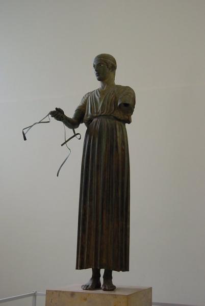 L'aurige était le cocher dans les jeux antiques panhélleniques. Cette statue, unique, découverte à Delphes, faisait partie d'un quadrige en bronze offert par le roi de Cirène. L'aurige, triomphateur, a la tête d'un adolescent et tient de la main droite les rènes des quatre chevaux.