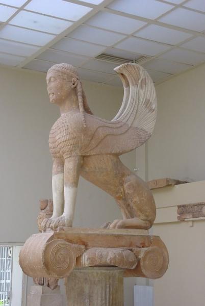Ce sphinx est une des plus belle sculpture de l'art grec archaïque. Il mesure 2,40 mètre de haut. Il avait été consacré au dieu Apollon par les habitants de l'ile de Naxos. Le monstre a un corps de lion, de grandes ailes au forme de faucilles, et un visage d'homme au cheveux longs tressés en nattes. Il était en effet d'usage pour les hommes de l'époque de se coiffer ainsi. Le sphinx était posé sur une colonne de 10 mètres de haut.