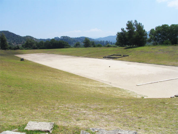 Le stade antique d'Olympie avait une longueur de 192 mètres environ. Il accueillait des épreuves de courses à pieds et en armes. Les courses hippiques (courses de chars) se déroulaient sur l'hippodrome parallèle au stade. Les gradins autour du stade n'étaient pas "en dur" : les spectateurs s'asseyaient simplement sur la pelouse des buttes autour du stade, ces dernières ayant été rehaussées pour accueillir le plus grand nombre. On estime ainsi la capacité d'accueil du stade à 45.000 spectateurs. La piste était en terre et en sable, et les lignes de départ et d'arrivée étaient délimitées par des dalles en calcaire (visible sur la photo).