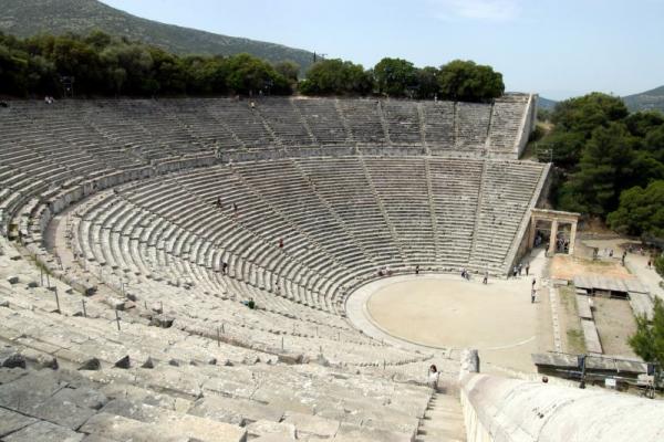 Le théâtre antique d'Epidaure est l'un des rares qui ait conservé sa scène circulaire d'origine, aussi appelée "Orchestra". Le théatre fut construit au IVe siècle avant J.C. Il possède une accoustique exceptionnelle. Il comprend deux rangées de gradins, la seconde ayant été ajoutée pendant l'occupation romaine de la Grèce. Le théâtre est encore en usage aujourd'hui : on y joue fréquemment concerts et festivals pendant la saison touristique.