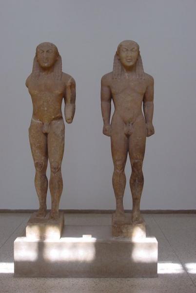 Ces deux statues sont des Kouroï. Il s'agit de statues funéraires, idéalisant les défunts, placées généralement sur un tombeau, pour apaiser le mort dans l'au-delà. Ainsi, les visages ont une expression souriante et mystique et les corps des proportions parfaites.