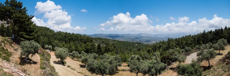 L'île de Rhodes est traversée par trois massifs montagneux d'altitude moyenne (1215 m au mont Ataviros), orientés nord-sud. Entre ces chaînes s'étendent des plaines fertiles. Grâce à son climat clément, doux et ensoleillé, Rhodes possède une végétation des plus riches. Forêts, genêts, bruyères et cistes s'épanouissent sur tout le territoire, ainsi que les nombreux arbres fruitiers caractéristiques des pays méditerranéens (orangers, figuiers etc.).