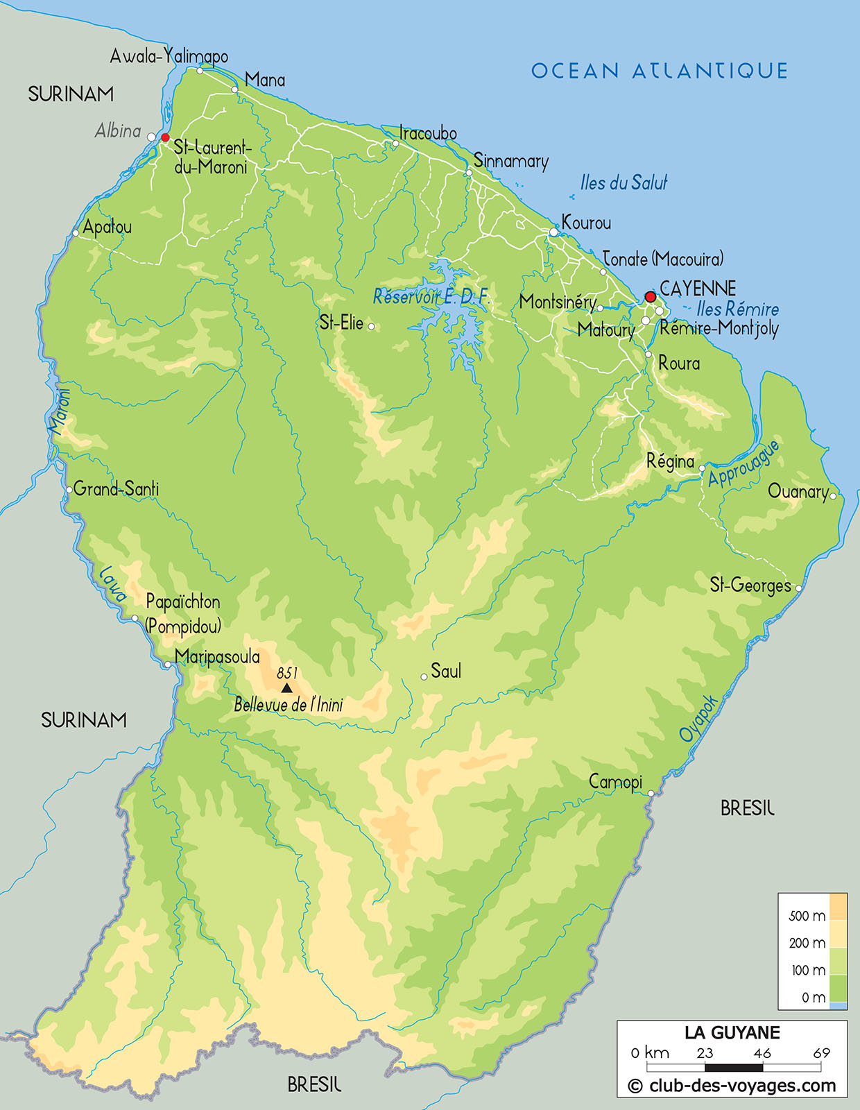 Nos différentes cartes de la Guyane à explorer: carte physique, carte routière, vue satellite. Pour tout savoir sur la géographie de la Guyane.