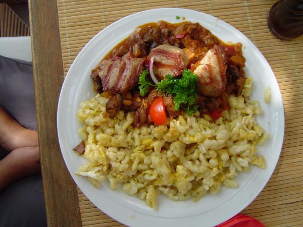 Filet mignon, et galuska aux oeufs, avec un genre de ratatouille, un veritable régal !