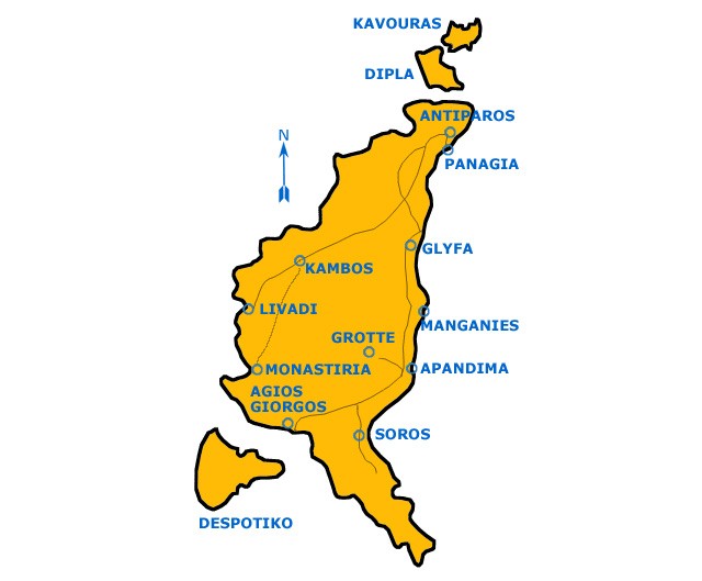 Antiparos est situé au Sud-Ouest de Paros, à un mille marin de celle-ci. Autrement dit, ces deux îles se touchent presque.