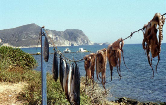 Vie quotidienne à Antiparos : Agios Giorgos - Poulpes et poissons sèchants au soleil |