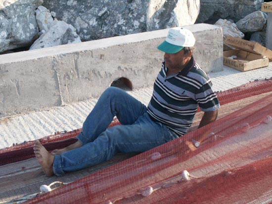 Vie quotidienne à Paros : Pêcheur préparant ses filets |