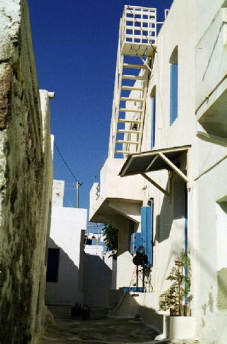 Plaka - Milos : Une ruelle avec un curieux escalier |