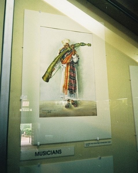 Exemple de peinture de Joy Adamson parmi celles exposées au musée national de Nairobi : ici, un musicien swahili jouant d'un instrument à vent unique, lui même visible au musée de Lamu.