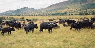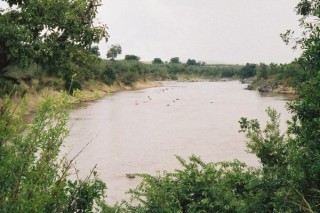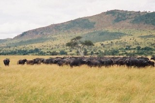 Lors de notre troisième safari, nous avons croisé un immense troupeau de buffles. Ceux-ci, bien que menaçant, peuvent être approchés de très près. Ensuite, nous sommes allés près de la rivière Mara, qui traverse le parc, jusqu'à la frontière tanzanienne : là évoluent crocodiles et rhinocéros en toute sérénité... Nous avons vu aussi notre premier groupe de girafes ainsi qu'un phacochère domestiqué (dans l'un des hôtels de la réserve).