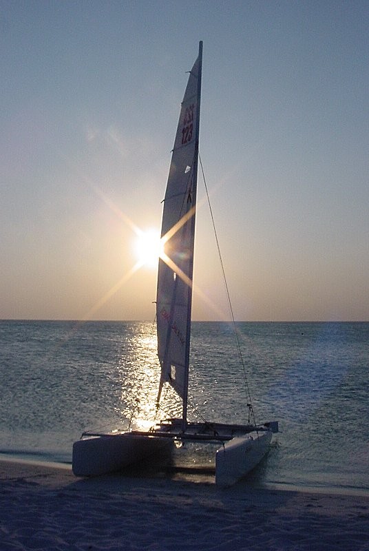 Lagon Rihiveli : Catamaran devant le soleil couchant |