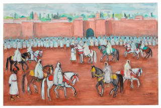 Il est particulièrement connu pour ses représentations majestueuses de cavaliers et de fantasias, qu’il peint avec une intensité vibrante et une palette riche en couleurs chaudes. Son œuvre, profondément enracinée dans la culture marocaine, a contribué à faire rayonner l’art marocain sur la scène internationale.