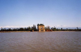 Le pavillon de la Ménara, que surplombent les monts enneigés de l'Atlas, date de l'époque saadienne (XVIe - XVIIe siècle). Il s'ouvre sur un immense bassin artificiel où se déroulaient les jeux nautiques (ou moussem). Il est aussi entouré par un parc d'oliviers d'une centaine d'hectares où aiment aujourd'hui se retouver les habitants de Marrakech.