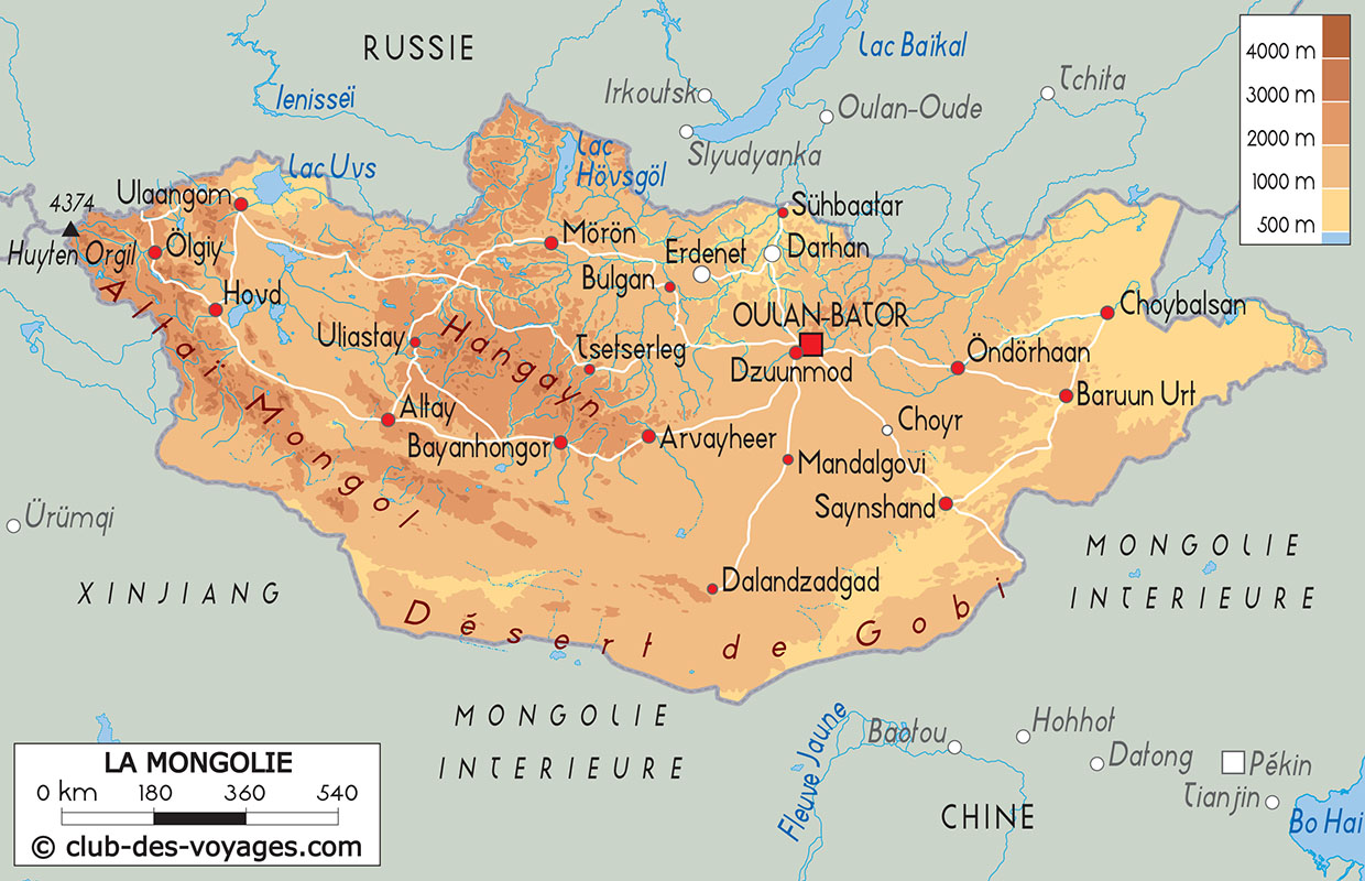 Nos différentes cartes de la Mongolie à explorer: carte physique, carte routière, vue satellite. Pour tout savoir sur la géographie de la Mongolie.
