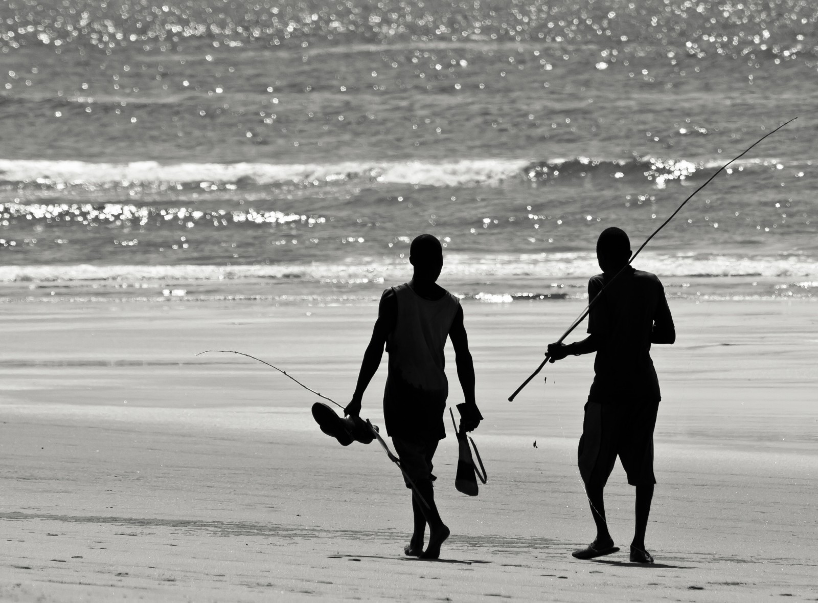 Deux pêcheurs pris à contrejour sur la plage Praia do Coco à Inhambane au Mozambique.