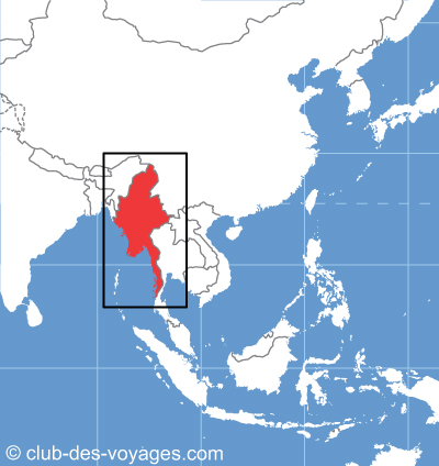Où se trouve le Myanmar ? Il s'agit du territoire en rouge sur la carte ci-dessus ! Le Myanmar se trouve en Asie et partage ses frontières avec les territoires suivants: Bangladesh (193 km), Chine (2185 km), Inde (1463 km), Laos (235 km), Thaïlande (1800 km).