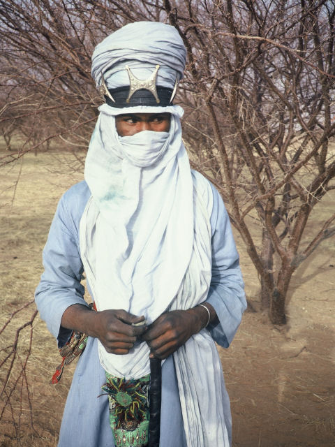 L'immense chèche est fixé par des gris-gris en argent. La bourse en cuir (taghallabt) se porte autour du cou.