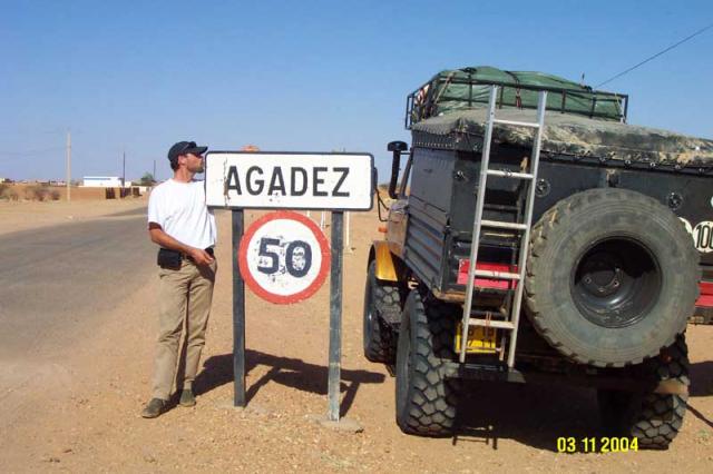 Parti de France le 16 Octobre par le "Biladi" nous atteignons enfin Agadez le 03 novembre après avoir parcouru 6600 kms via Tombouctou. De joie, José embrasse la panneau