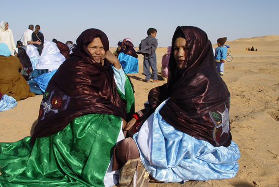 Les femmes Touarègues portent des tenues éblouissantes bleu ou vert vif avec un voile indigo brodé ou blanc constellé de paillettes.