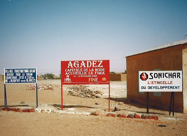 Signe d'une initiative récente, ces pancartes flambant neuves font la promotion du FIMA, principal événement culturel, de la SONICHAR, unique industrie locale, et du tourisme, principale source de revenus à Agadez