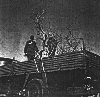 Photo de Roger Balsom, 8 novembre 1973 L'arbre du Ténéré, après avoir été renversé par un camion, est chargé sur un autre camion pour être exposé [Suite...]