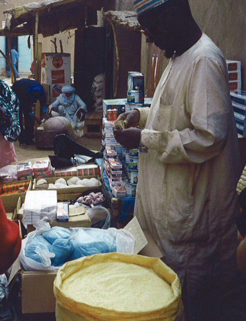Le marchand Haussa est installé au coin d'une rue et vend au détail des piles, des boîtes d'allumettes, des cigarettes ou des sachets de lessive...