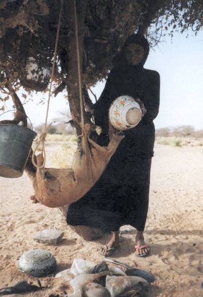 L'eau est stockée dans une outre formée par une peau de chèvre entière. Les pattes constituent les poignées et le cou, le déversoir...