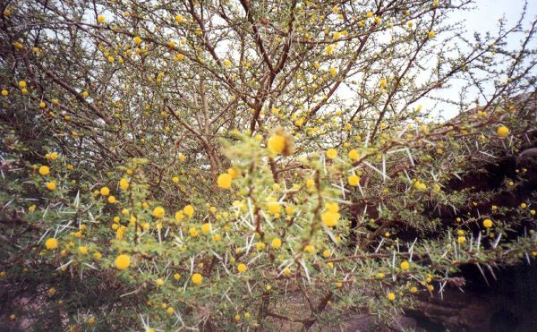 Végétation épineuse adaptée au désert. Les feuilles minuscules permettent de limiter l'évaporation de l'eau. Les épines sont nécessaires à la défense contre les chèvres de brousse.