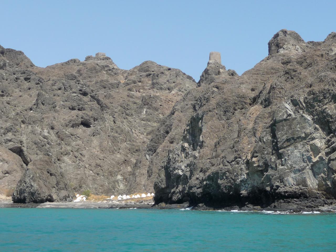 On observe une tour défensive et en petit cimetierre musulman au pied des rochers